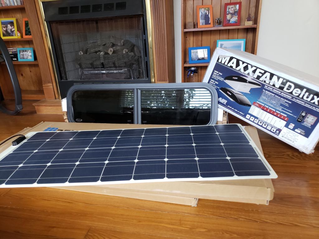 Once the windows have arrived, go ahead and make some templates. I really wish MotionWindows would send some sort of template for the cut, but they do not. The best way that I found was to find a piece of cardboard large enough for the window and lay the metal frame/flange on the cardboard and trace the inside of the frame. Repeat for all the window shapes.