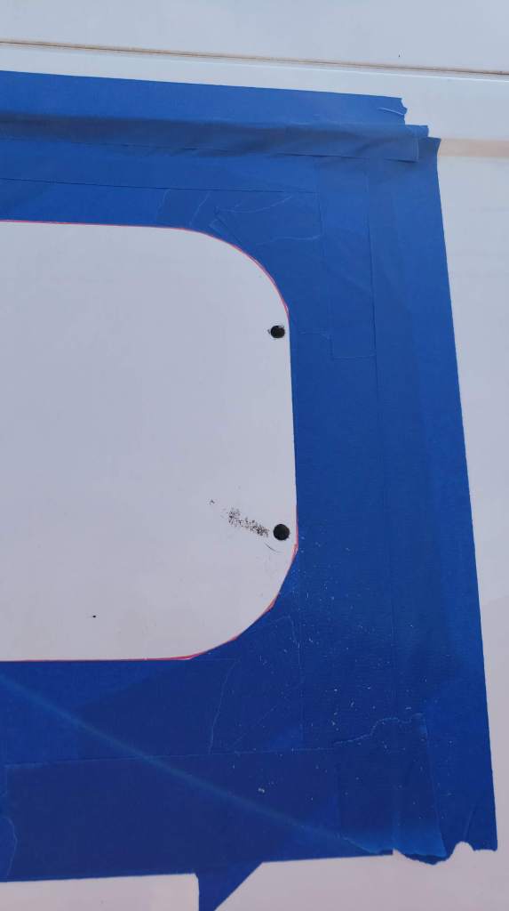 After tracing the template to the body of the van again, start taping along the outer edge of the window shape with painters tape. Doing so will help prevent any scratches from happening while resting the jigsaw against the van during the main cut. One tip I’ve seen to help during the cutting is to add some screws as ‘handles’ to the piece of metal that will be removed during the cut. The vibrations tend to become problematic.