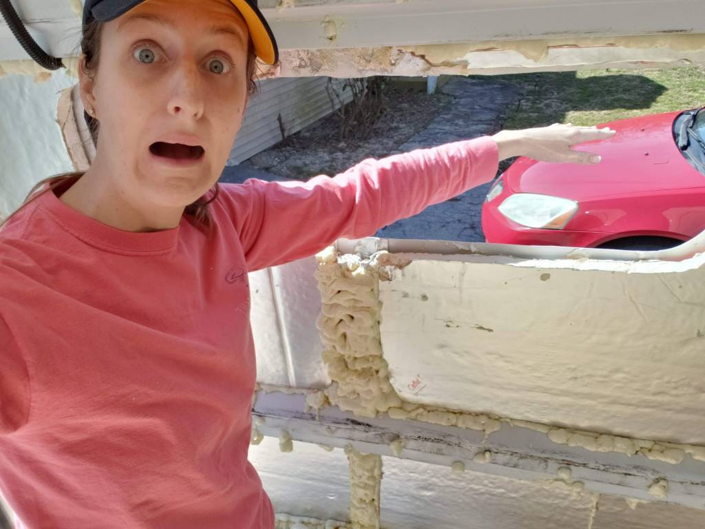 After the templates are traced on the inside of the wall, remove any of the vertical ribs that are in the way. Alternatively, you can just cut the rib where the window will be and remove a section of it. We used an oscillating saw to do the second option, but I believe it may have been easier to remove it entirely before putting in insulation.