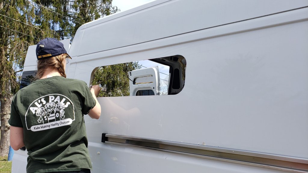 Tape up some plastic trash bags on the inside of the van underneath the window to catch any metal shavings that fall before getting to work.