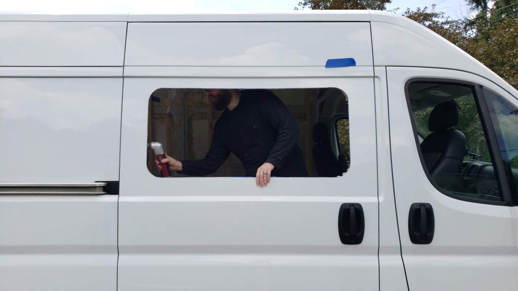 For the actual installation, it’s necessary to clean the surface of the van around the cut and the edge of the window that will rest on the surface of the van prior to installing the included weather stripping. Use some window cleaner for that task, then start sticking the weather proof foam to the window edge and slide the window in.