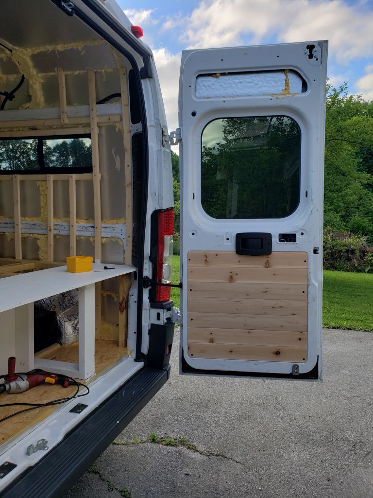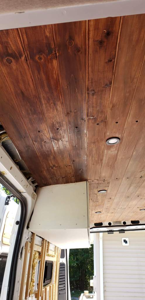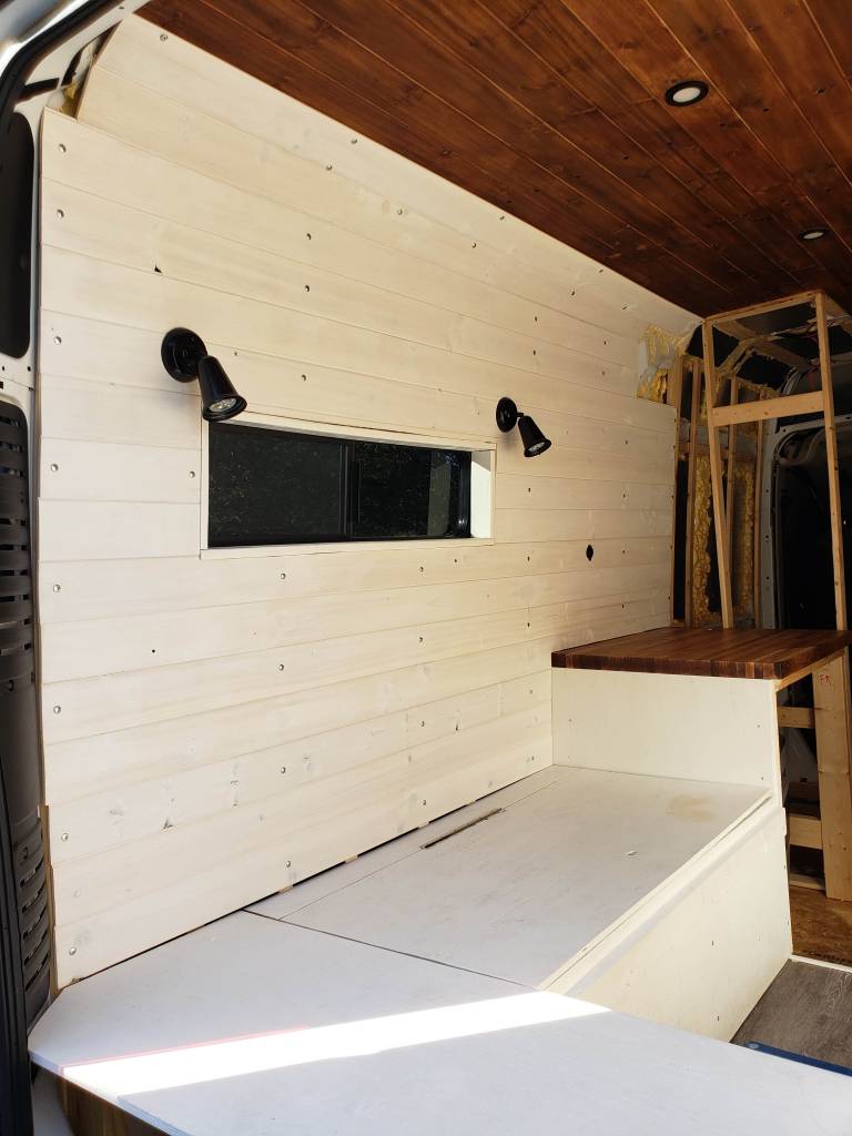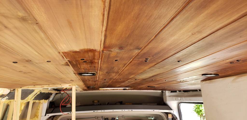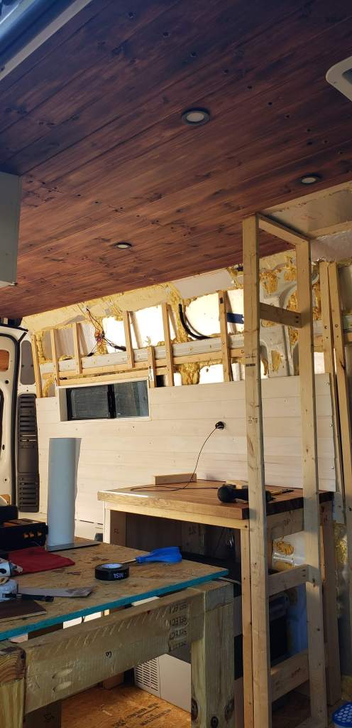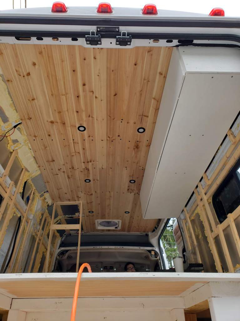 To save some money we waited until the bed, cabinets, and wet room was built out. Then we installed cedar tongue and groove panels only on the areas that were exposed.