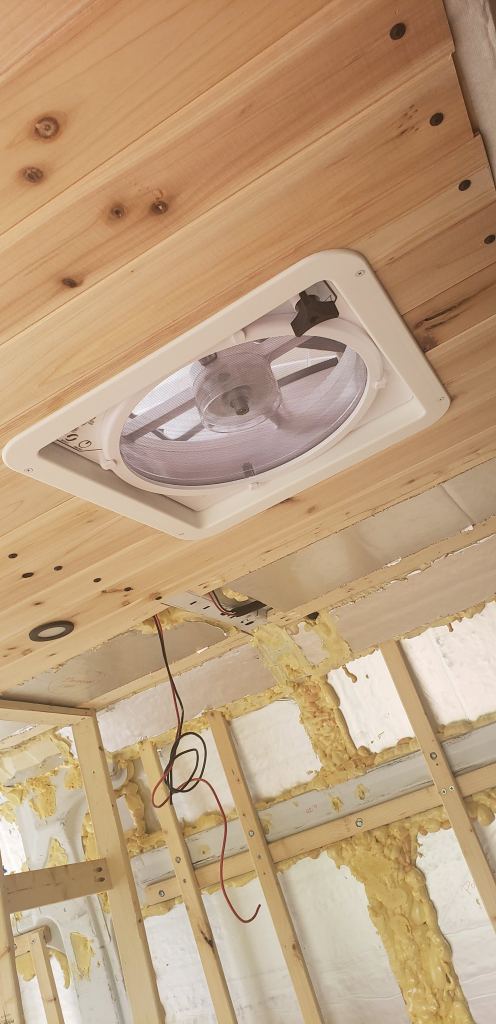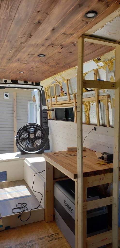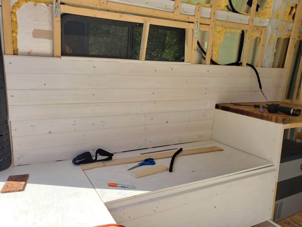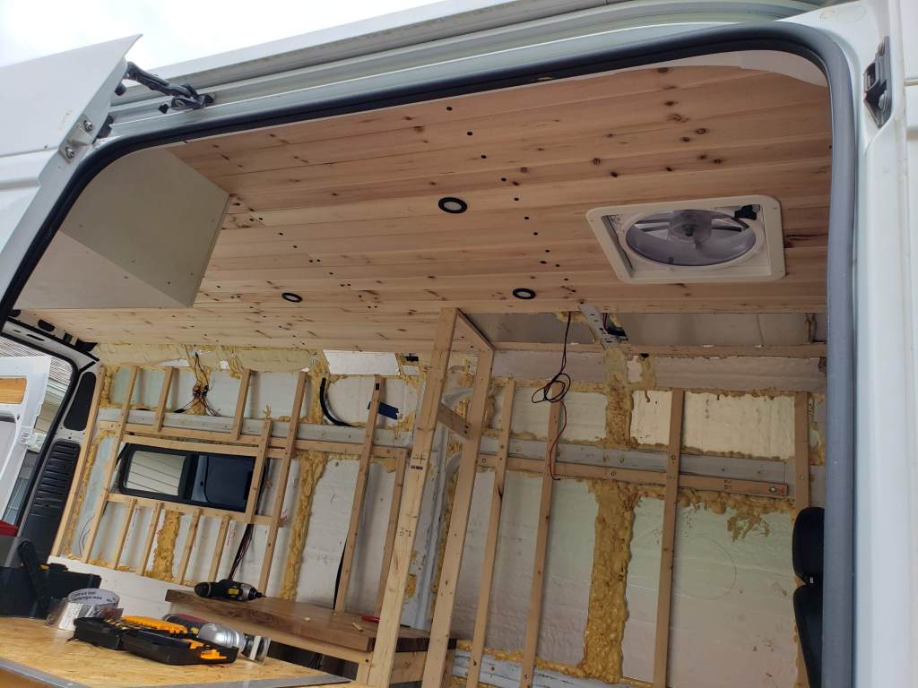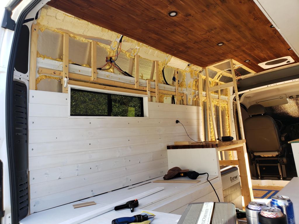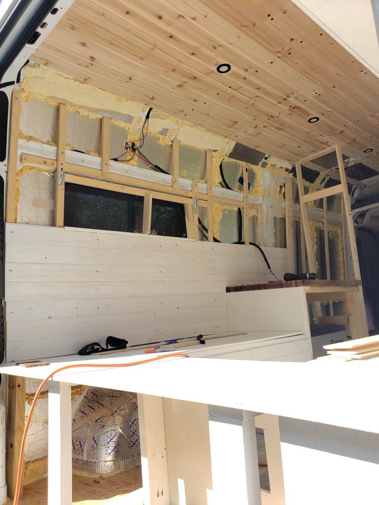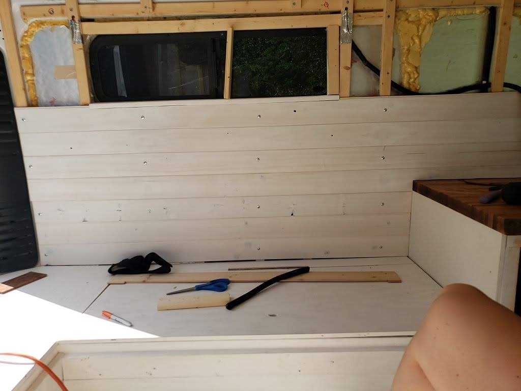 There’s nothing like seeing your van come together. The point Edith started feeling more like a home for us was when the cedar tongue and groove planks were installed. Covering up the ugly insulation did wonders.