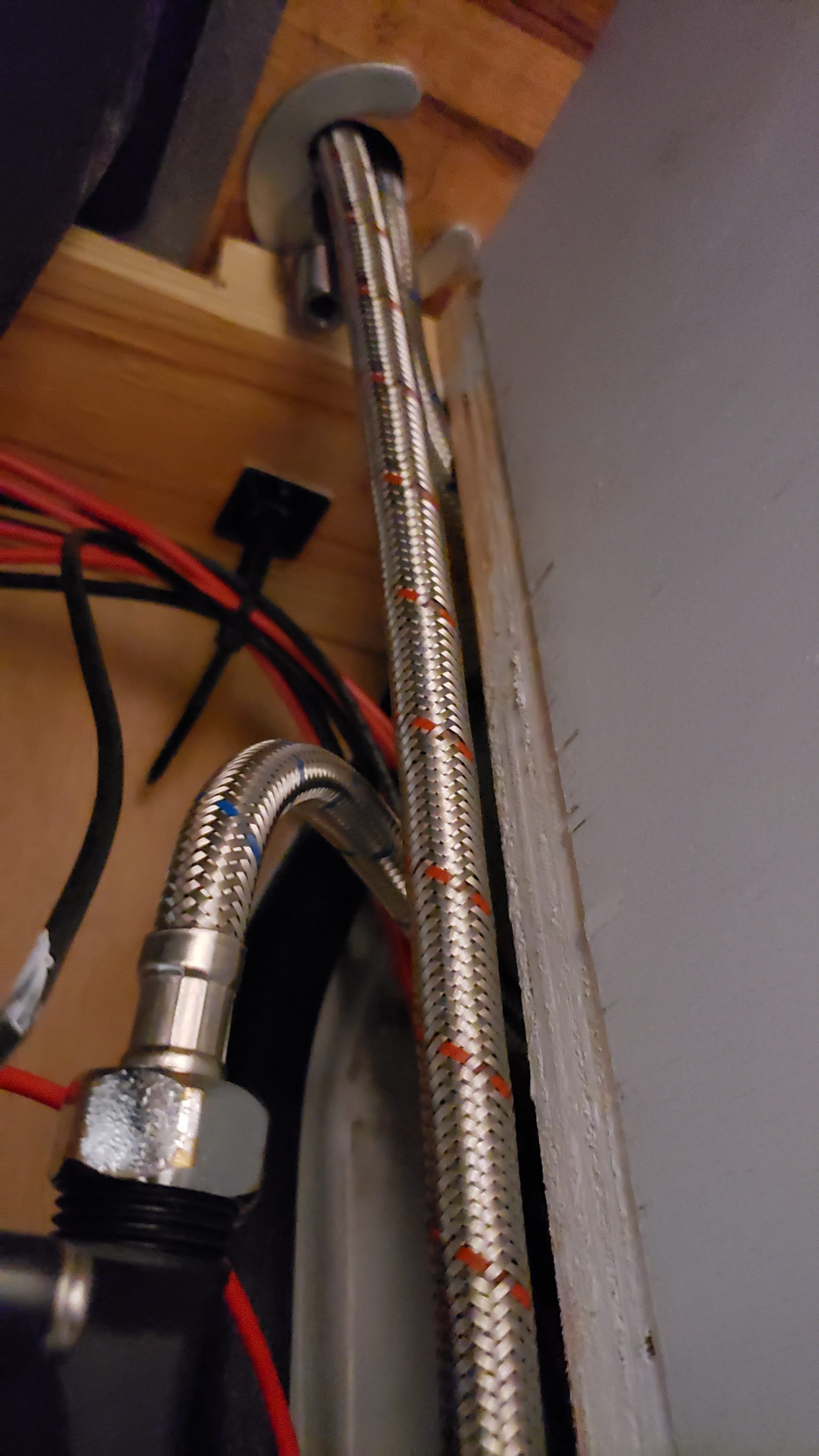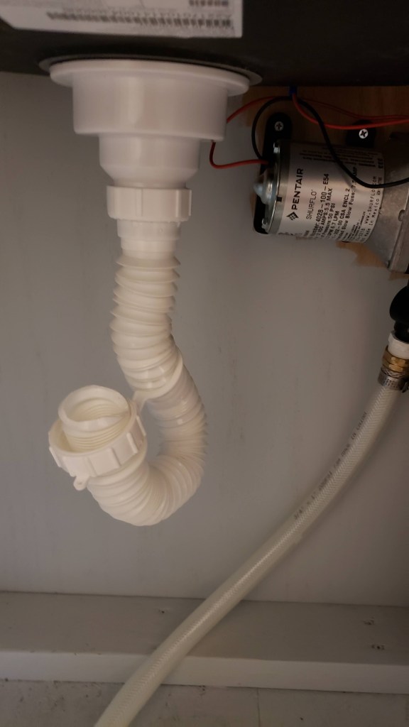 One of the first things I did was to mount the pump and make sure the electrical component worked. Doing this step now means measurements will be exact later. The faucet we installed came with some braided hoses, so the pump could only be so far away from everything.