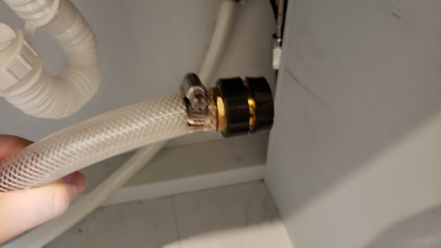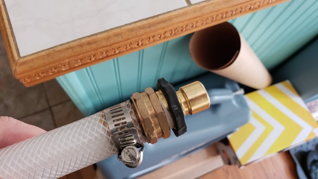 For the hose in the water tank, add the male end of the quick-disconnect. Using a flat-head screwdriver, tighten the clamp around the barbed end of the adapter that slides into the hose.